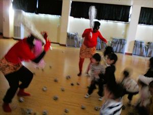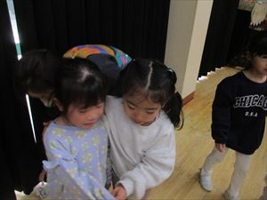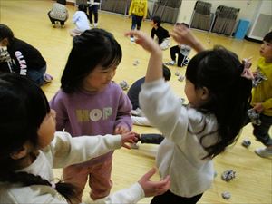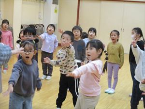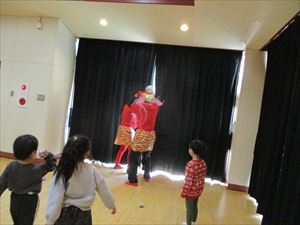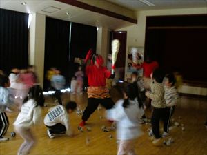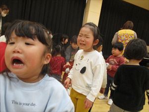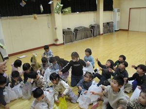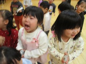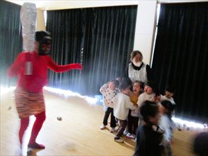 子ども達の表情は、一気に変わりホールの隅に一斉に逃げる子ども達。 新聞紙の豆を何度も何度も拾っては投げて、果敢に鬼に立ち向かっていく子。 少し離れた所から一生懸命に豆を投げる子、大泣きしながら先生の後ろから 鬼を覗く子、子ども達の様々な姿が見られました。 『 おにはそと! おにはそと! おにはそと! 』 みんなの心の中の鬼は、退治できたかな? |