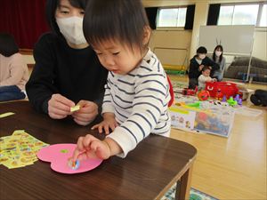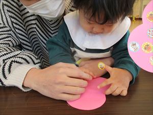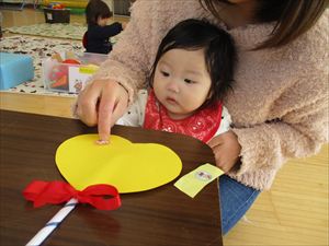 今日のちびっこ広場の様子です。 今回は、バレンタインデー間近なので【 ハートのステッキ 】の 製作を楽しみました~★★★ ハートの台紙に好きなだけシールを貼っちゃおう~💛💛💛 小さな指で一生懸命にシールを剥がして、ペタン! もうひとつ選んで ペタン! たくさん貼って、とっても素敵なハートのステッキが完成しましたよ。 |