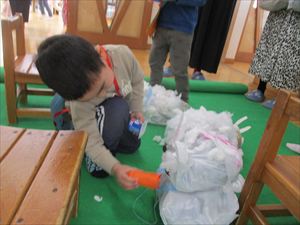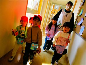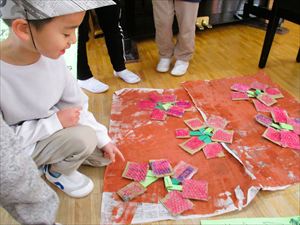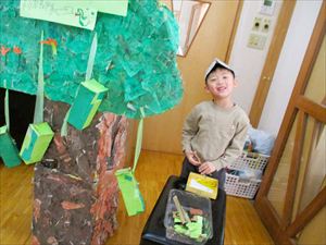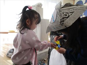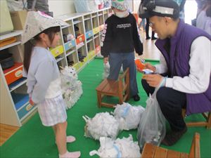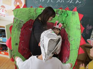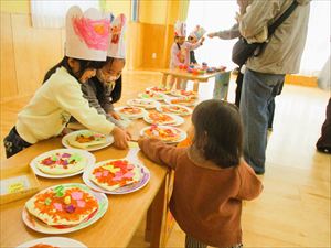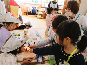 2クラス合同で、6つのグループに分かれました。 【 動物ふれあい・エサやりコーナー 】【 大きな動物コーナー 】 【 水が好きな動物コーナー 】【 植物コーナー 】【 ゲームコーナー 】 【 お土産コーナー 】 動物園には何があるのか、どんな動物がいるのか、考え意見を出し合い その中からやりたいコーナーを決めました。 実際に自分達が動物園に行って見た事を思い出したり、体験したことのある 餌やりをやってみようといろいろなアイディアを出して、お客さんを楽しませる ためにはどうしたらいいか考えて形にしていったゆり組の子ども達。 グループでイメージを共有しながら、必要な物を分担して作っていました。 『 今なら、ワニの餌やりが体験できますよ! 』 『 モグラたたきも面白いですよ~ 』 『 記念にかわいい動物の耳のカチュウシャはいかかですか? 』 接客も心から楽しんでやっている子ども達の頼もしい姿をたくさん見ることが できました。今年の【 ごっこ遊び 】も大成功でした~★★★ |