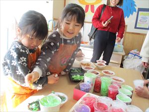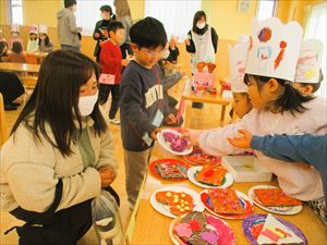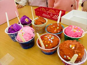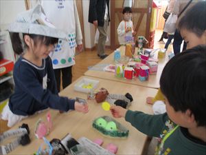 こちらは、たんぽぽ組(年少)さんの【 スイーツやさん 】です。 1組 ホットケーキ・ゼリー 2組 アイスクリーム・チョコレート 紙粘土、絵の具、段ボール、新聞紙など色々な素材を使って準備しました。 ひとりひとりが、思いを形にして作り上げたスイーツが勢ぞろい。 カラフルでとっても美味しそうな商品が並んでいますね~。 『 いらっしゃいませ~ 』 子ども達の元気な声が、多目的ホールから聞こえてきましたよ。 『 イチゴ味がおすすめですよ~ 』 『 ふわふわのホットケーキがおいしいよ 』 お店屋さんになりきって可愛らしい売り子さん達が、大活躍! お客さんとお店屋さんの両方を交代で体験します。 |
