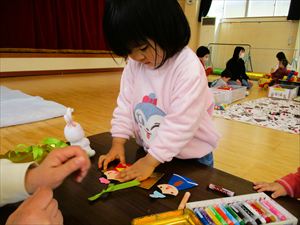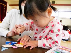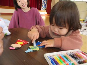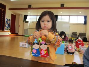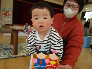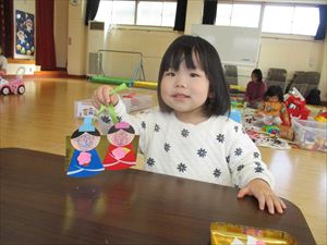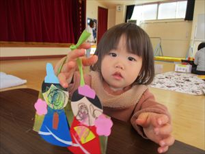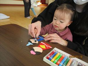 今回は、【 おひなさま 】の製作を楽しみました。 お内裏様とお雛様の顔をクレヨンでなぐり描きして、 両面テープを剥がして、金の屏風の台紙に並べて貼ります。 周りに桃の花を貼って・・・わぁ~華やかになったね💕 とっても素敵なおひなさまの飾りが完成しました~★★★ |