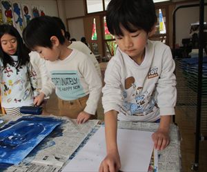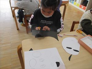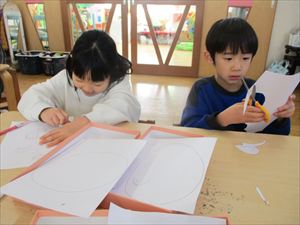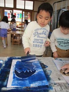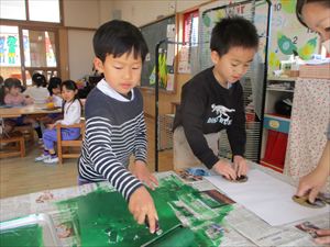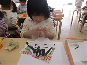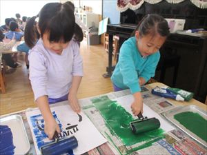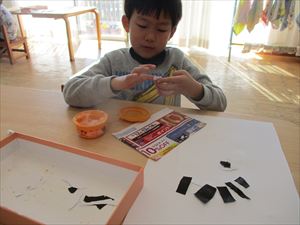 ゆり組(年長)さんが、紙版画の製作【 自分の顔 】をしている様子です。 『 自分の顔って、どんな顔? 』 鏡を覗いて自分の顔を見たり、自分の顔を手で触ってみたり。 『 わたしって、どんな顔? 』『 ○○君は、目が大きいよ 』 友達に聞いてみたり・・・。 土台は画用紙を使って顔の輪郭に目、鼻、口などのパーツを作り 糊付けし、まつ毛や髪の毛など細かな部分にも気を配りながら 丁寧に作っていました。 |
