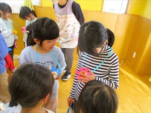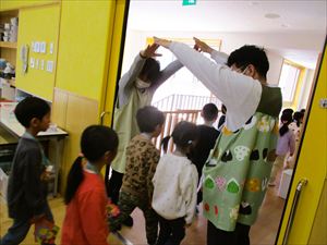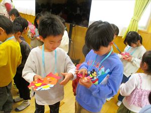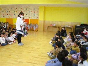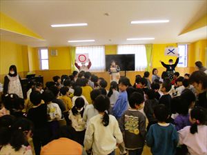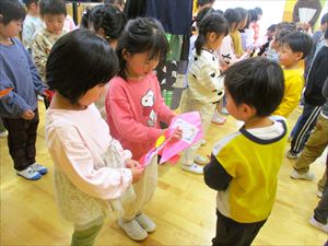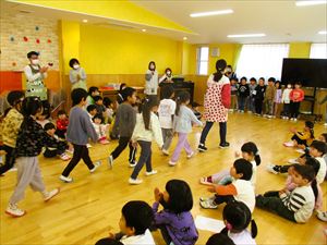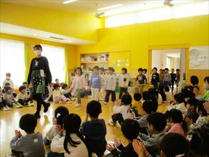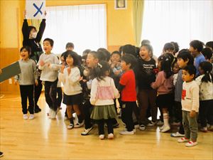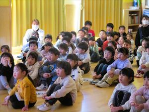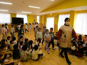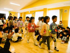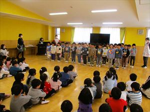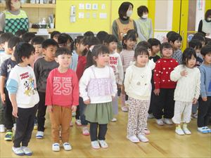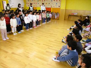 | 今日は、お別れ会が行われました。在園児(ひまわり組、たんぽぽ組)の温かい拍手の中、クラス毎にゆり組(年長)さんが入場してきました! |