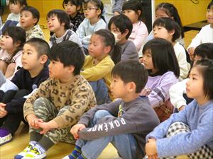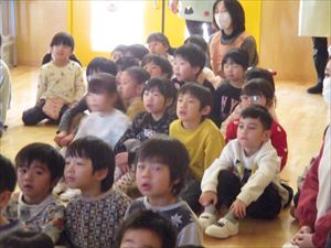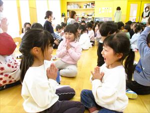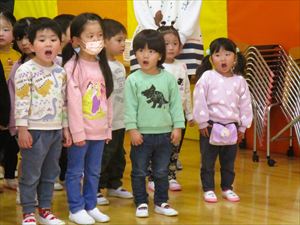 ♫ さよならぼくたちのこどもえん ぼくたちの遊んだ庭 桜の花びら降るころは ランドセルのいちねんせい ♫ みんな静かに耳を傾け、体を揺らしながら聞き入っている子もいました。 ゆり組の子ども達の優しく力強い歌声がホールに響きます。 歌が歌い終わると、自然に大きな拍手が湧きました。 卒園まで、あと10日。 |