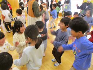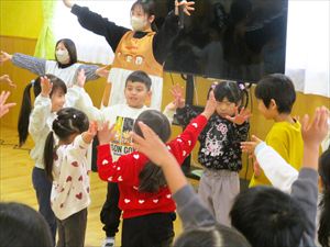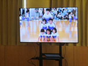 など、行事の写真が次々と出てきました。 ○×クイズやリズムダンスも楽しみました。ホール内は、子ども達の笑顔 の花がたくさん咲いていました~★★★ |