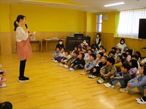 | 【 贈る言葉 】年少、年中時の担任の先生から贈る言葉がありました。ゆり組の子ども達は、大きくうなずきながら大好きな先生の話を聞いていました。