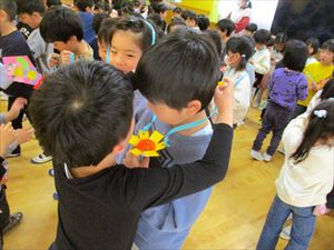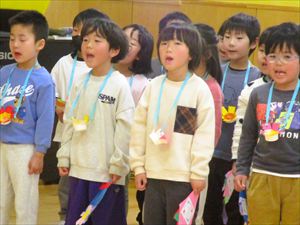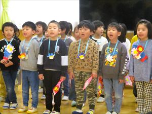 カッコいい姿をいっぱい見せてくれたゆり組さんに在園児から 心を込めて歌と言葉のプレゼントです。 『 ぼくたち わたしたちも かっこいいゆり組さんになれるよう頑張ります 素敵な一年生になってください 』 この日の為に練習してきた ♫ みんなともだち ♫ を歌いました。 |