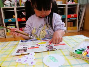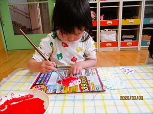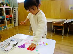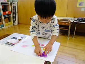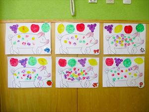 すずらん組(満3歳児)さんの製作の様子です。 リクエスト1位のすずらん組人気絵本【 なにをたべてきたの 】 を題材に製作をしました。 果物は、クレヨンと絵の具を使ってはじき絵に挑戦して色つけ しました。 『 ぶたさんをおなかいっぱいにしてあげよう~! 』 『 ここにも ポン!こっちにも ポン 』 豚のお腹の中は、たんぽをつかってお腹いっぱいにしてあげました💕 |