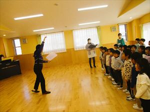 | ゆり組さんが、卒園式に向けて元小学校教諭の澤根先生に卒園式の歌【 さよならぼくたちのこどもえん 】の指導を