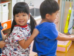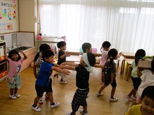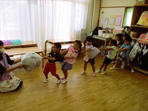 『 うんとこしょ! どっこいしょ! 』 たんぽぽ組(年少)さんの保育室から元気な掛け声が聞こえてきました。 【 おおきなかぶ 】絵本の読み聞かせをすると、一人の男の子が ♬ よいしょ よいしょ ♬ と、楽しそうに歌い始めました。 そこで、子どもたちと一緒にビニール袋に新聞紙を丸めて入れて 大きなかぶを作って【 おおきなかぶごっこ 】を楽しむ事に しました。すると、 『 ぼくは、おじいさんやる! 』『 じゃあ、わたしはおばあさん! 』 『 わたしは、いぬ! 』 絵本のお話と同じように次々と順番に並んだ子どもたち。 『 うんとこしょ! どっこいしょ! まだまだかぶは抜けません! 』 どの子もとっても楽しそうな笑顔で楽しんでいました。 |